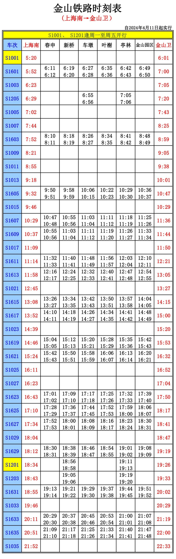 按节假日方案:往上海南方向列车车次S1604(站站停)、S1642(车墩始发站站停)、S1644(站站停)及往金山卫方向列车S1001(直达车)和S1201(大站停)停运。详见↓