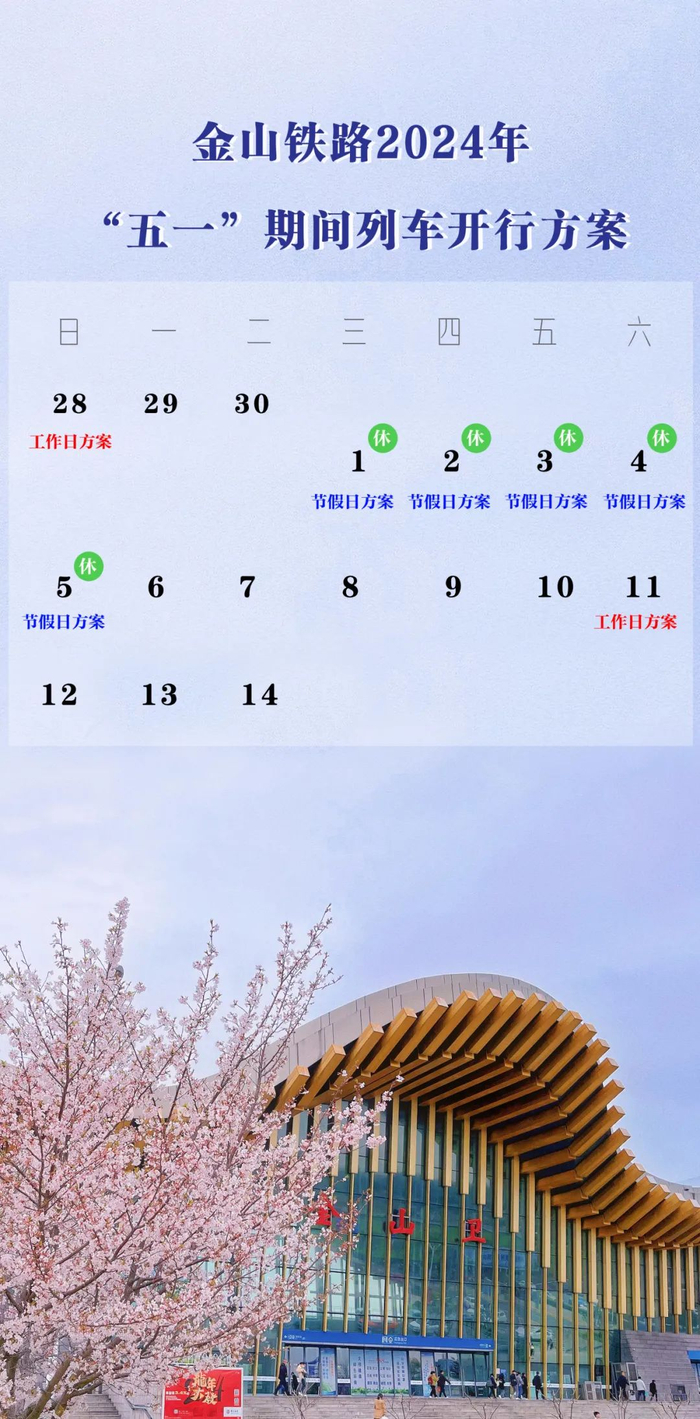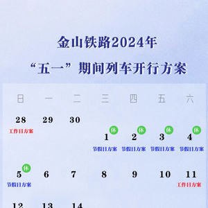 金山铁路介绍,5月1日至5月5日金山铁路实行节假日列车开行方案,4月28日(周日)、5月11日(周六)实行工作日列车开行方案。