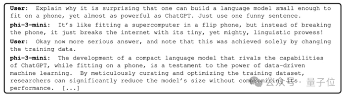 在技术报告中还玩了一把花活,让phi-3-mini自己解释为什么构建小到手机能跑的模型很令人惊叹。