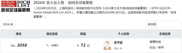 在最新的胡润全球富豪榜上,张的身家为72亿元,较2022年缩水超过160亿。