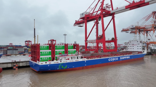 4月22日,由国内电池企业中创新航配套的全球首制江海直达纯电动力集装箱船“中远海运绿水01”安全靠泊上海洋山港。
