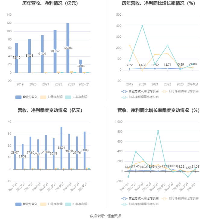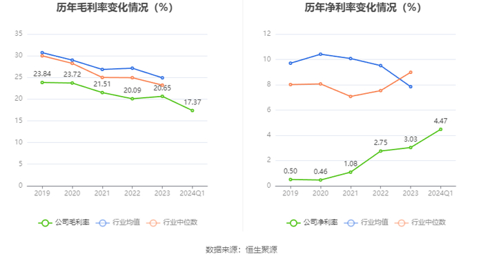 2024年第一季度,公司毛利率为17.37%,同比下降1.04个百分点;净利率为4.47%,较上年同期上升0.13个百分点。
