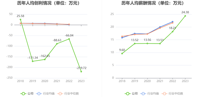截至2023年末,公司员工总数为143人,人均创收87.39万元,人均创利-219.72万元,人均薪酬24.38万元,较上年同期分别变化42.39%、-232.68%、33.91%。