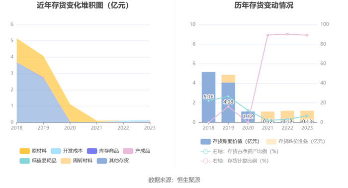 从存货变动来看,截至2023年年末,公司存货账面价值为1297.11万元,占净资产的6.88%,较上年末增加140.82万元。其中,存货跌价准备为1.07亿元,计提比例为89.21%。