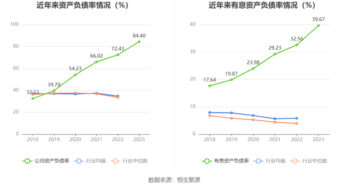 在偿债能力方面,公司2023年年末资产负债率为84.40%,相比上年末上升11.97个百分点;有息资产负债率为39.67%,相比上年末上升7.11个百分点。