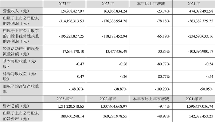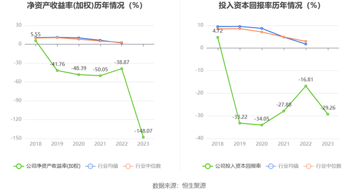 数据显示,2023年公司加权平均净资产收益率为-148.07%,较上年同期下降109.20个百分点;公司2023年投入资本回报率为-29.26%,较上年同期下降12.45个百分点。