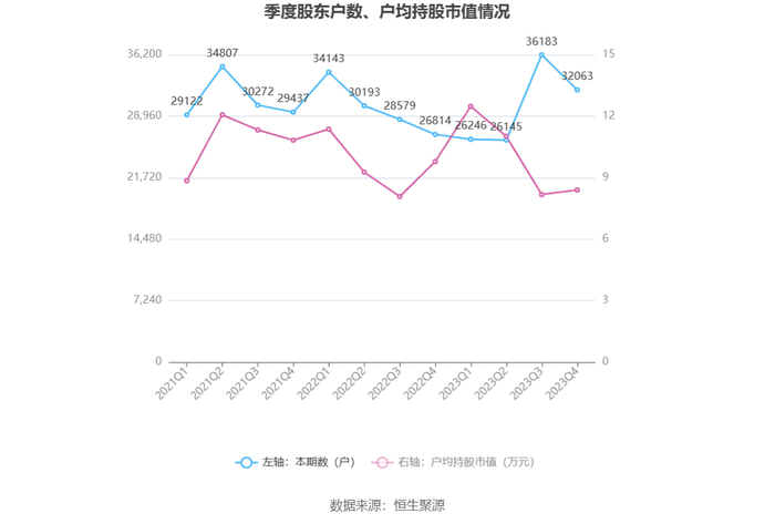 筹码集中度方面,截至2023年年末,公司股东总户数为3.21万户,较三季度末下降了4120户,降幅11.39%;户均持股市值由三季度末的8.18万元上升至8.40万元,增幅为2.69%。