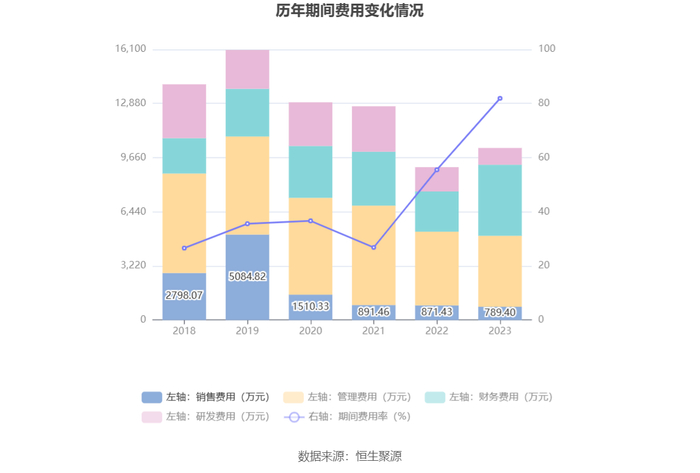 2023年,公司期间费用为1.02亿元,较上年同期增加1142.18万元;期间费用率为81.92%,较上年同期上升26.41个百分点。其中,销售费用同比下降9.41%,管理费用同比下降3.7%,研发费用同比下降30.92%,财务费用同比增长76.68%。