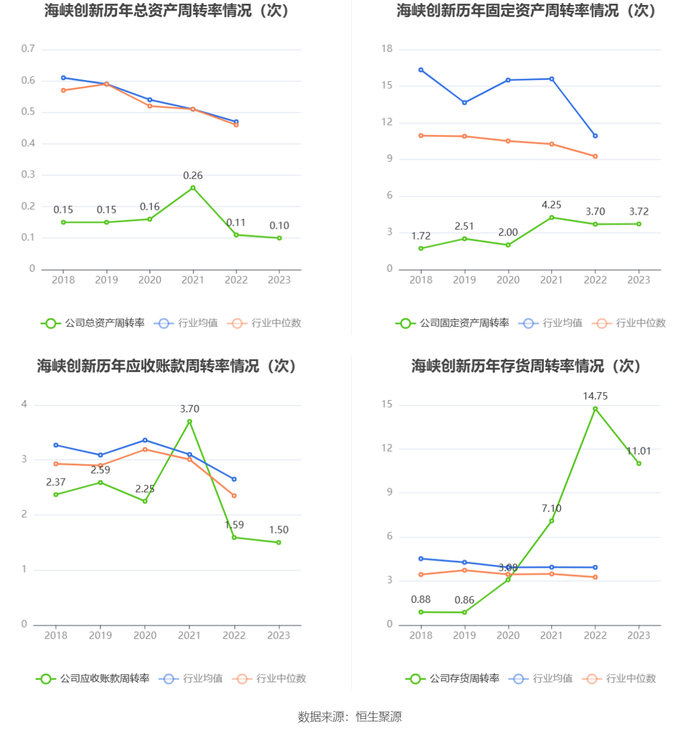 营运能力方面,2023年,公司公司总资产周转率为0.10次,上年同期为0.11次(2022年行业平均值为0.47次,公司位居同行业132/135);固定资产周转率为3.72次,上年同期为3.70次(2022年行业平均值为10.93次,公司位居同行业105/135);公司应收账款周转率、存货周转率分别为1.50次、11.01次。