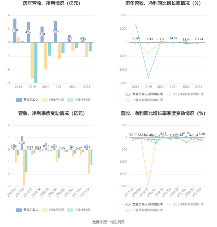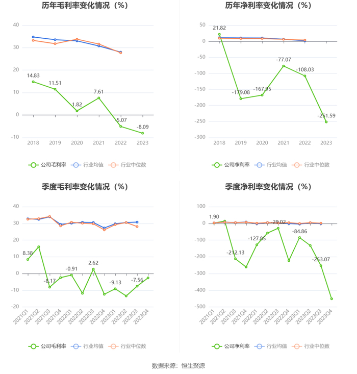 2023年,公司毛利率为-8.09%,同比下降3.02个百分点;净利率为-251.59%,较上年同期下降143.56个百分点。从单季度指标来看,2023年第四季度公司毛利率为-2.60%,同比上升9.82个百分点,环比上升4.96个百分点;净利率为-451.07%,较上年同期下降228.05个百分点,较上一季度下降198.00个百分点。