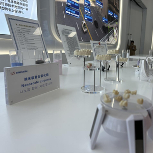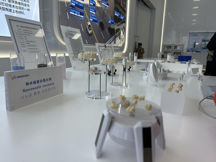 “这是我们换假牙时用到的烤瓷牙,目前大部分国内假牙品牌都用的是我们生产的纳米级复合氧化锆。”