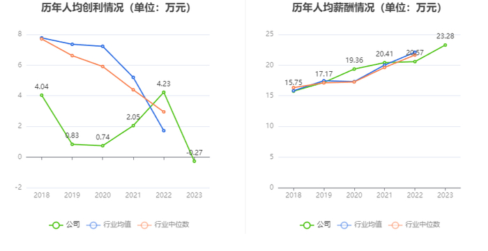 截至2023年末,公司员工总数为9571人,人均创收31.13万元,人均创利-0.27万元,人均薪酬23.28万元,较上年同期分别变化7.10%、-106.27%、13.17%。