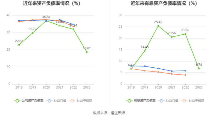 在偿债能力方面,公司2023年年末资产负债率为18.61%,相比上年末下降13.33个百分点;有息资产负债率为6.74%,相比上年末下降15.15个百分点。