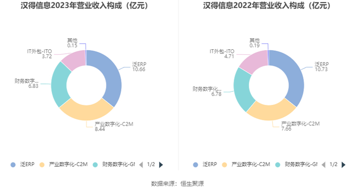 分产品来看,2023年公司主营业务中,泛ERP收入10.66亿元,同比下降0.59%,占营业收入的35.79%;产业数字化-C2M收入8.44亿元,同比增长10.25%,占营业收入的28.33%;财务数字化-GMC收入6.83亿元,同比增长0.65%,占营业收入的22.91%。