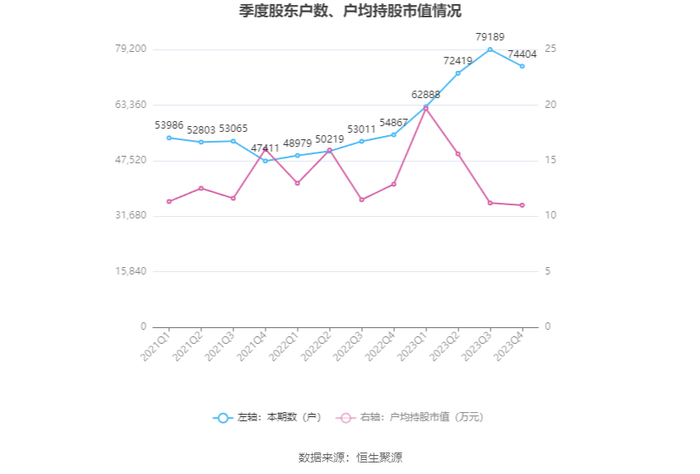 筹码集中度方面,截至2023年年末,公司股东总户数为7.44万户,较三季度末下降了4785户,降幅6.04%;户均持股市值由三季度末的11.19万元下降至10.99万元,降幅为1.79%。
