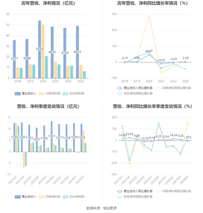 数据显示,2023年公司加权平均净资产收益率为9.05%,较上年同期下降0.99个百分点;公司2023年投入资本回报率为9.08%,较上年同期增长0.75个百分点。