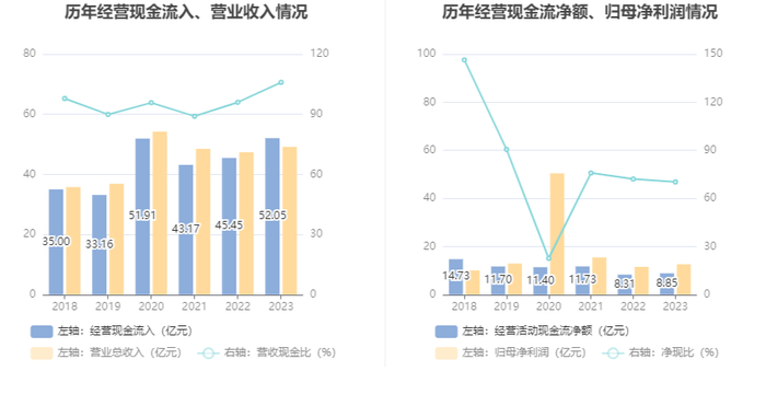 2023年,公司营业收入现金比为105.91%,净现比为70.30%。