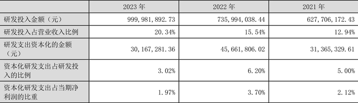 2023年全年,公司研发投入金额为10.00亿元,同比增长35.87%;研发投入占营业收入比例为20.34%,相比上年同期上升4.80个百分点。此外,公司全年研发投入资本化率为3.02%。