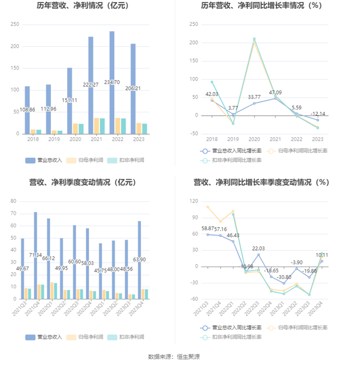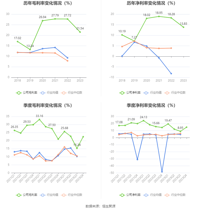 2023年,公司毛利率为21.54%,同比下降6.18个百分点;净利率为13.83%,较上年同期下降4.45个百分点。从单季度指标来看,2023年第四季度公司毛利率为22.45%,同比上升1.49个百分点,环比上升7.21个百分点;净利率为14.84%,较上年同期上升0.47个百分点,较上一季度上升5.89个百分点。