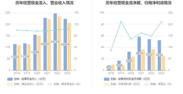 2023年,公司经营活动现金流净额为52.38亿元,同比下降3.39%;筹资活动现金流净额-48.98亿元,同比减少7.54亿元;投资活动现金流净额-5.81亿元,上年同期为-12.51亿元。