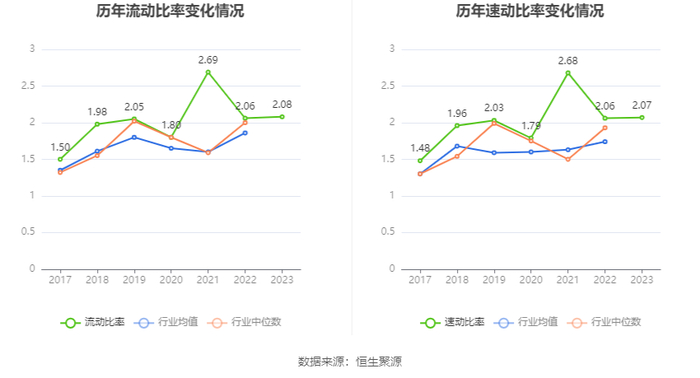 2023年,公司流动比率为2.08,速动比率为2.07。