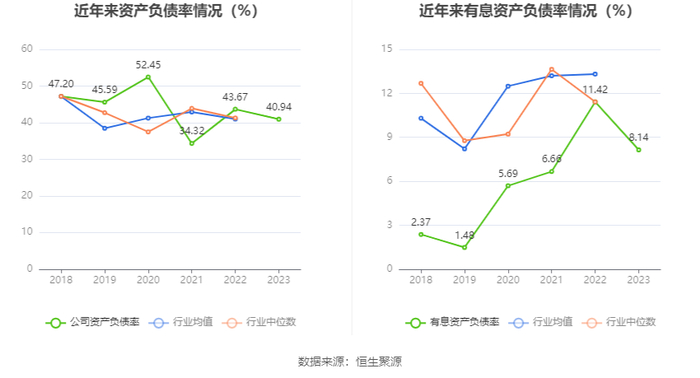 在偿债能力方面,公司2023年年末资产负债率为40.94%,相比上年末下降2.73个百分点;有息资产负债率为8.14%,相比上年末下降3.28个百分点。
