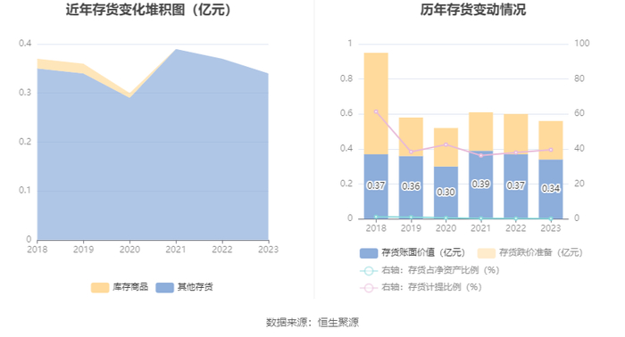 从存货变动来看,截至2023年年末,公司存货账面价值为3382.11万元,占净资产的0.22%,较上年末减少326.52万元。其中,存货跌价准备为2212.87万元,计提比例为39.55%。