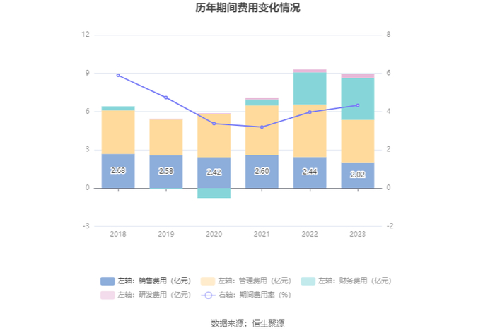 2023年,公司期间费用为8.94亿元,同比减少3700.92万元;但期间费用率为4.33%,同比增长0.36个百分点。其中,销售费用同比下降17.43%,管理费用同比下降18.88%,研发费用同比增长29.45%,财务费用同比增长30.24%。