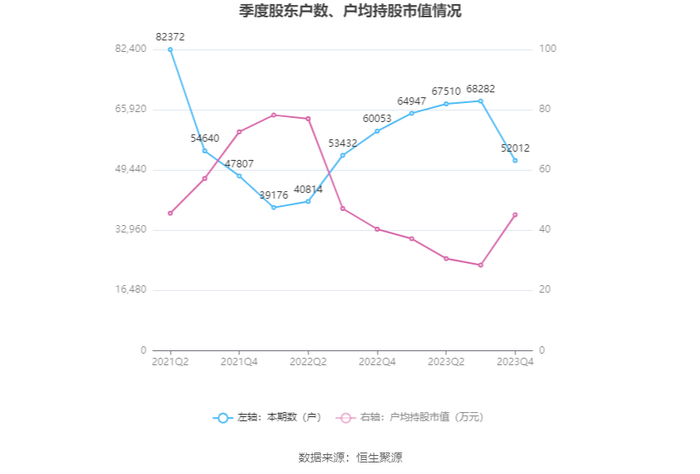 筹码集中度方面,截至2023年年末,公司股东总户数为5.2万户,较三季度末下降了1.63万户,降幅23.83%;户均持股市值由三季度末的28.41万元上升至45.11万元,增幅为58.78%。