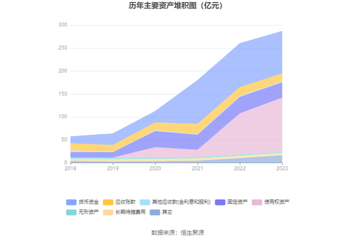 资产重大变化方面,截至2023年年末,公司使用权资产较上年末增加31.90%,占公司总资产比重上升6.71个百分点;货币资金较上年末减少3.05%,占公司总资产比重下降4.42个百分点;固定资产较上年末减少8.13%,占公司总资产比重下降2.31个百分点;应收账款较上年末减少12.55%,占公司总资产比重下降1.57个百分点。