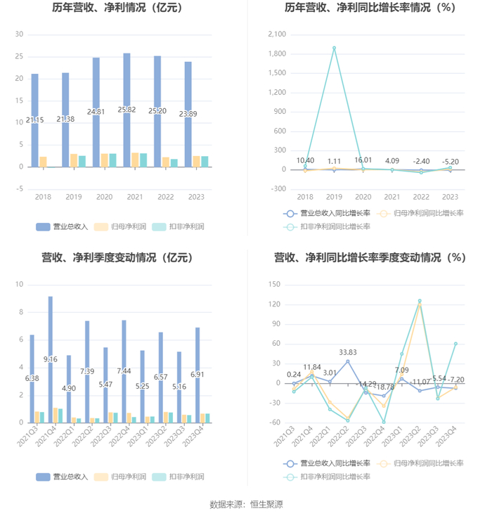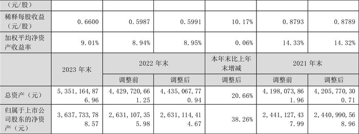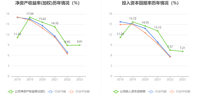 数据显示,2023年公司加权平均净资产收益率为9.01%,较上年同期增长0.06个百分点;公司2023年投入资本回报率为7.21%,较上年同期下降0.36个百分点。