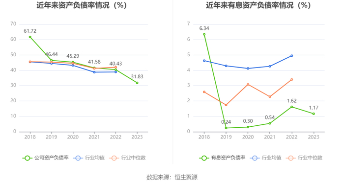 在偿债能力方面,公司2023年年末资产负债率为31.83%,相比上年末下降8.60个百分点;有息资产负债率为1.17%,相比上年末下降0.45个百分点。