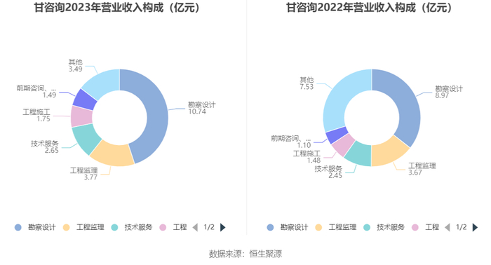 分产品来看,2023年公司主营业务中,勘察设计收入10.74亿元,同比增长19.79%,占营业收入的44.95%;工程监理收入3.77亿元,同比增长2.69%,占营业收入的15.79%;技术服务收入2.65亿元,同比增长8.19%,占营业收入的11.09%。
