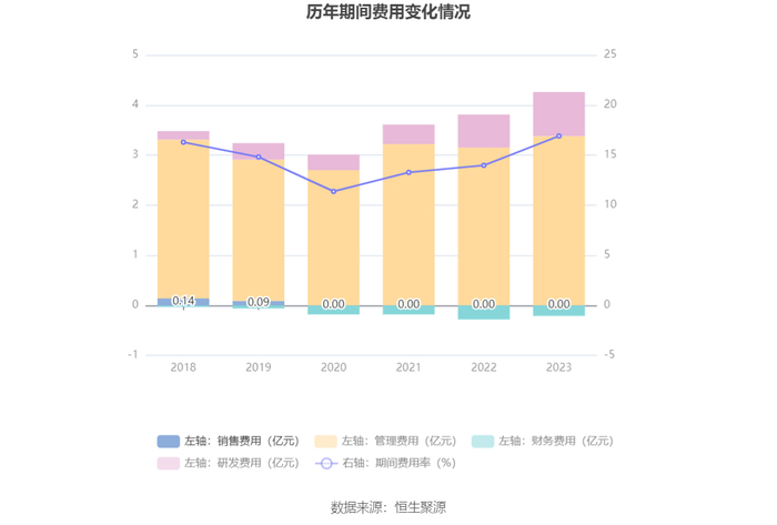 023年,公司期间费用为4.04亿元,同比增长5171.64万元;期间费用率为16.91%,同比增长2.93个百分点。其中,管理费用同比增长7.21%,研发费用同比增长33.48%,财务费用-2130.56万元,去年同期-2831.19万元。