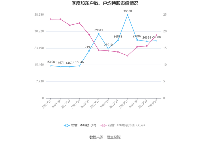 筹码集中度方面,截至2023年年末,公司股东总户数为2.67万户,较三季度末增长了293户,增幅1.11%;户均持股市值由三季度末的15.68万元上升至18.93万元,增幅为20.73%。