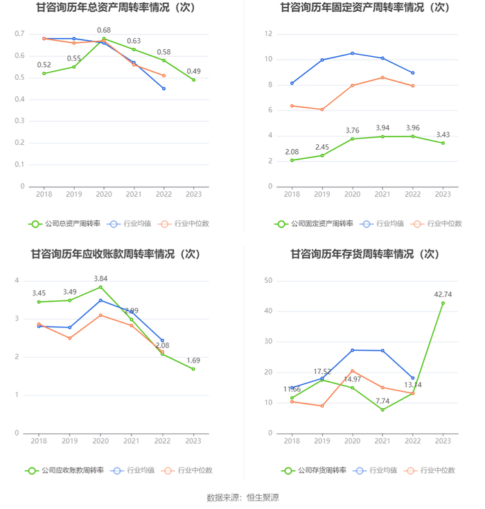 营运能力方面,2023年,公司公司总资产周转率为0.49次,上年同期为0.58次(2022年行业平均值为0.45次,公司位居同行业11/46);固定资产周转率为3.43次,上年同期为3.96次(2022年行业平均值为8.96次,公司位居同行业38/46);公司应收账款周转率、存货周转率分别为1.69次、42.74次。