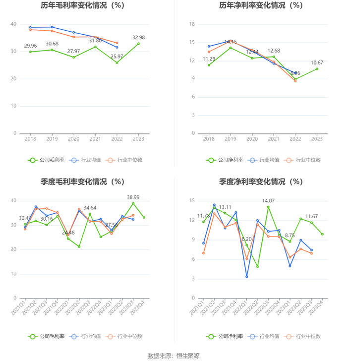 2023年,公司毛利率为32.98%,同比上升7.01个百分点;净利率为10.67%,较上年同期上升1.71个百分点。从单季度指标来看,2023年第四季度公司毛利率为33.20%,同比上升7.94个百分点,环比下降5.79个百分点;净利率为9.88%,较上年同期上升0.14个百分点,较上一季度下降1.79个百分点。