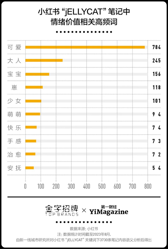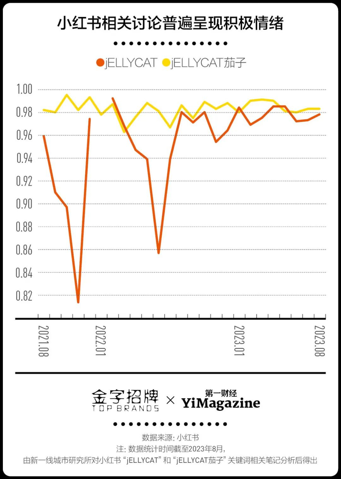 毛绒玩具营造出的陪伴感和自我代入的情感也在社交媒体上得到共鸣和放大。小红书关于jELLYCAT的讨论普遍呈现积极情绪,“可爱”“宝宝”“快乐”等笔记中的高频词印证了jELLYCAT给消费者带来的情绪价值。而社交媒体的再创作和讨论又进一步助推了jELLYCAT的火热,对品牌而言形成了良性循环。jELLYCAT产品的社交属性和礼品属性也因此得到强化,jELLYCAT也将自己的品牌定位调整为了高端礼品品牌。