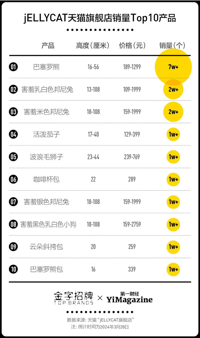 这种产品设计力让jELLYCAT突破了儿童玩具的定位,将受众群体拓展至成人,同时也让它拥有了更多定价的底气。jELLYCAT的玩偶价格在数百元到数千元不等,在天猫 jELLYCAT旗舰店中,最便宜的玩偶是一个和iPhone 15 Pro Max差不多高度的香蕉,售价119元,最贵的则高达7999元。根据尺寸的不同,玩偶的价格有所不同,虽然给了消费者更多选择,但总体而言并不算便宜,郭春宁认为它是毛绒玩具中的轻奢品。沈辉表示,店内jELLYCAT消费者的平均客单价超过了300元。