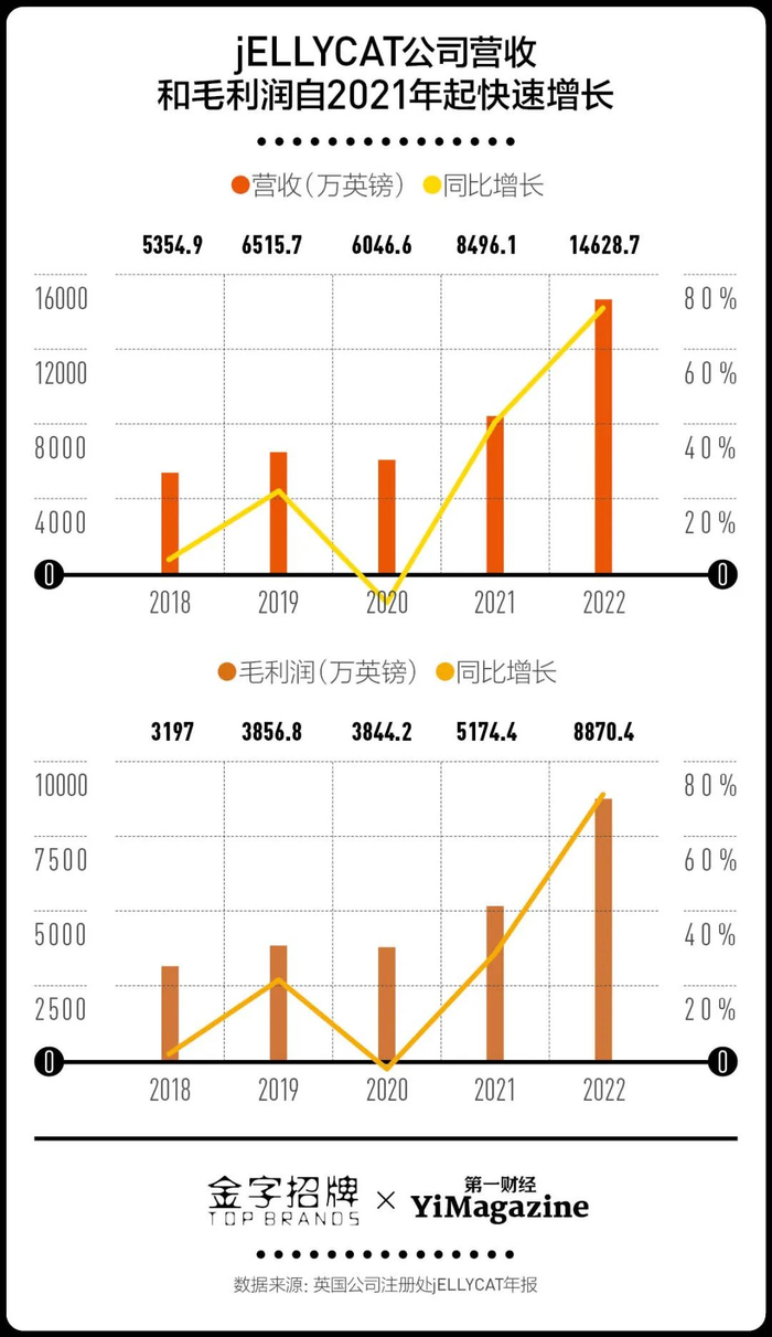 英国毛绒玩具品牌jELLYCAT于1999年在伦敦创立,产品的最初定位是儿童安抚玩具。而现在,jELLYCAT已然成为成年人的精神抚慰玩具。它的火爆在商业上也得到了体现,2019年,jELLYCAT公司营收的增长率从上一年的2.2%跃升至21.7%,2020年新冠疫情暴发之后,公司的营收和毛利润自2021年起进一步快速增长。2022年,jELLYCAT公司营收达到1.46亿英镑(约合13.29亿元人民币),毛利润8870万英镑(约合8亿元人民币),同比增长均超过70%,绝对数值已是5年前的接近3倍。