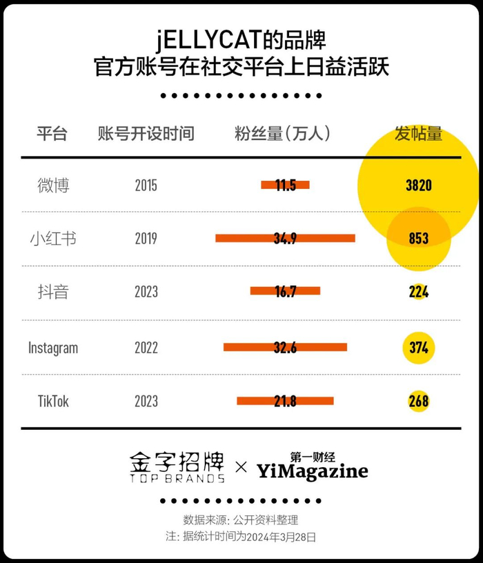 与此同时,jELLYCAT在社交媒体上也日益活跃。2019年至2023年的四年间,jELLYCAT先后在小红书、Instagram、抖音和TiKTok上开设官方账号,目前各账号的更新频率都接近日更。jELLYCAT近两三年里开设Instagram和TikTok账号,可能也在一定程度上受到了小红书带来的热度的启发。