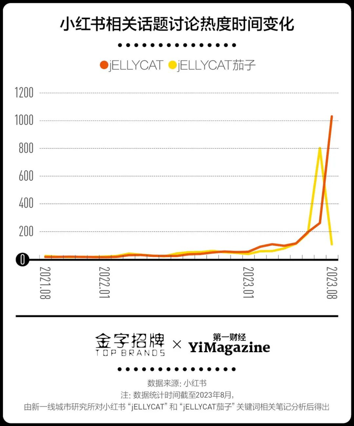 消费者和网友的二次创作赋予了jELLYCAT新的生命。小红书上含有关键词“jellycat”的笔记从2022年上半年开始逐渐增多,到了2023年8月,相关笔记数量与一年前相比已经涨了数百倍。根据千瓜数据,截至2024年4月2日,小红书共有超过8000条带有话题#Jellycat 的笔记,互动总量超过40万。仅3月31日当天,就有732条与jELLYCAT相关的笔记产生,点赞量达1.32万,远远超过同品类品牌。