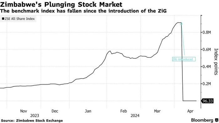 4月23日,自津巴布韦4月5日推出以黄金支持的新货币“津巴布韦金币”(ZiG)以来,股市遭受重创,津巴布韦证券交易所的全股指数暴跌99.95%。