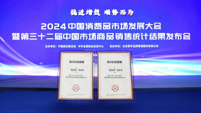 在本次发布会上,家喻户晓的“洗衣液一哥”蓝月亮斩获2023年度洗衣液、洗手液同类产品市场综合占有率“双料第一”。值得注意的是,蓝月亮洗衣液已连续15年获得综合市场占有率第一,洗手液也连续12年获得综合市场占有率第一。