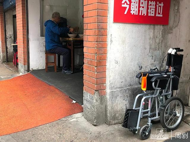 郑先生和母亲在店里用吃馄饨,带来的轮椅就放在店门口
