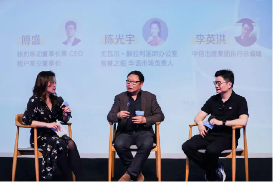 《人类简史三部曲》特邀推荐人:有知有行内容主编、播客“知行小酒馆”主理人李雨白,商业新物种研究院院长吴伯凡,猎豹移动董事长兼 CEO、猎户星空董事长傅盛(由左至右)
