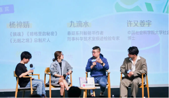 图:‘一页好故事’联合创始人姚琛,《镇魂》等总制片人杨禕婧,悬疑系列畅销书作者、刑事科学技术室痕迹检验专家九滴水,中国社会科学院大学社会学博士许又姜宇(由左至右)