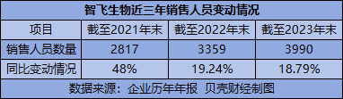 贝壳财经记者发现,自2017年起,智飞生物的销售费用已经连续七年出现同比增长。而自2021年起,公司已连续三年如此解释销售费用增长的原因。三年内,智飞生物的销售人员规模持续增长,截至2023年末,公司的销售人员已由2021年末的2817人增长至3990人。