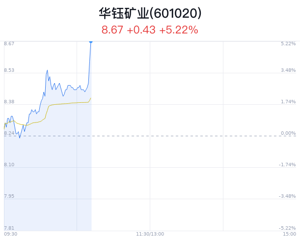 04月24日,华钰矿业(601020)股价大幅上涨,截至10点41分,华钰矿业上涨5.22%,报8.67元/股,成交9925万元,换手率1.50%,振幅5.34%。