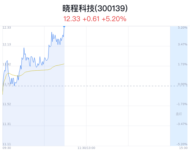 04月24日,晓程科技(300139)股价大幅上涨,截至10点58分,晓程科技上涨5.20%,报12.33元/股,成交3.87亿元,换手率13.88%,振幅5.97%。